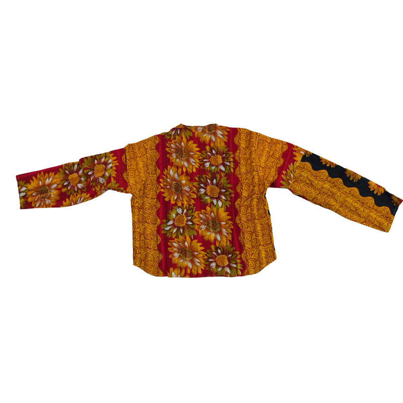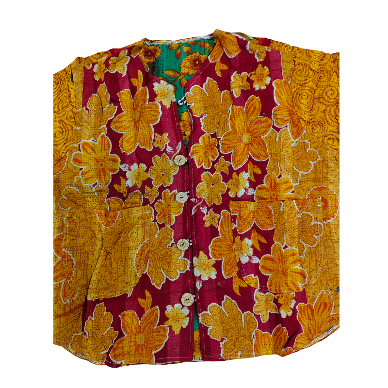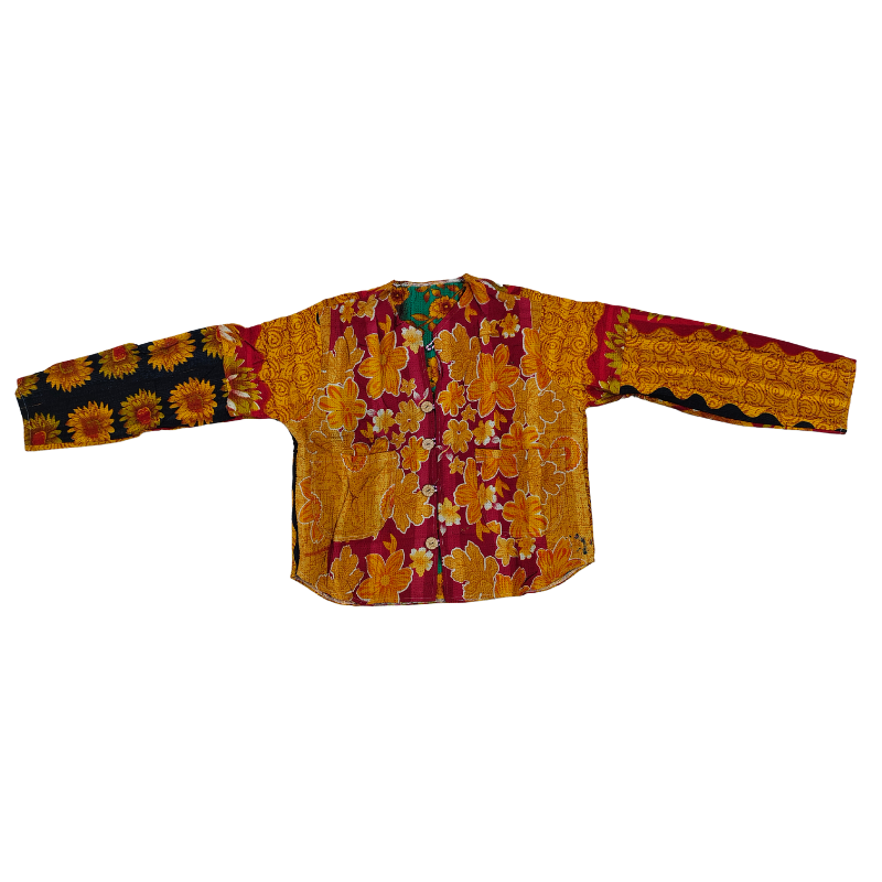 Make a bold boho statement with this Kantha quilt jacket, handcrafted from vintage cotton sarees. Featuring vibrant patchwork, floral and abstract motifs, and contrast front pockets, this button-down jacket is both stylish and sustainable. The relaxed fit and lightweight cotton make it perfect for layering year-round. No two pieces are alike—each jacket is a unique expression of art.