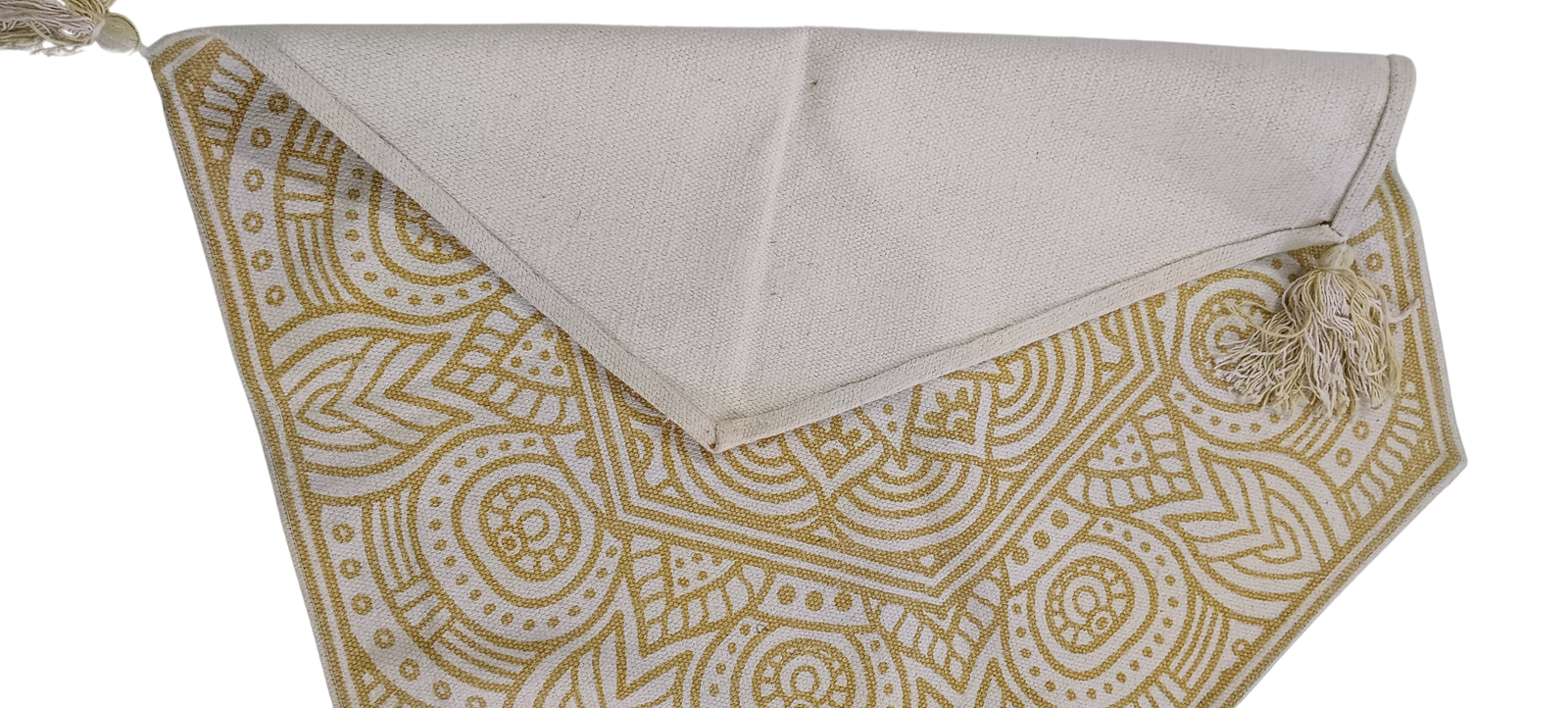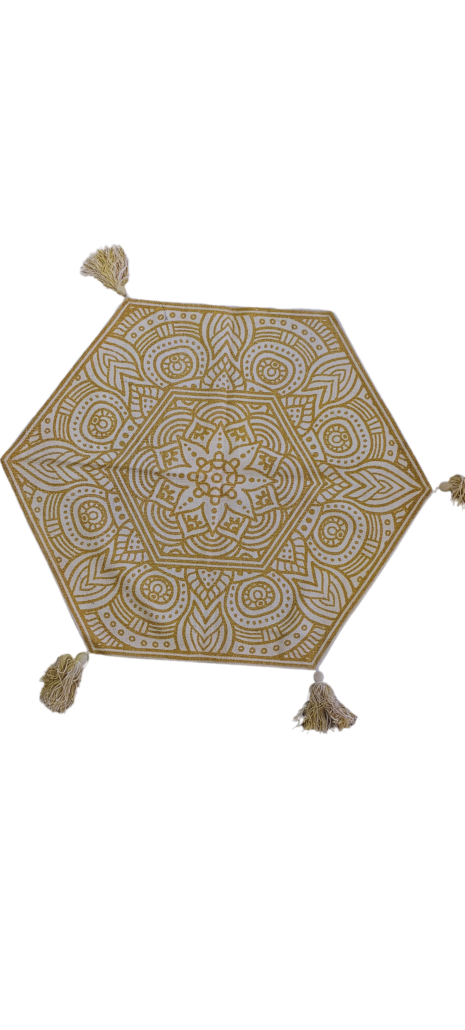 The warm golden print on a neutral background adds a touch of cultural sophistication, while the playful tassels on each corner give it a handcrafted finish. Whether placed on a hardwood floor, over marble, or layered with other rugs, this hexagon printed rug adds a stylish twist to any space.