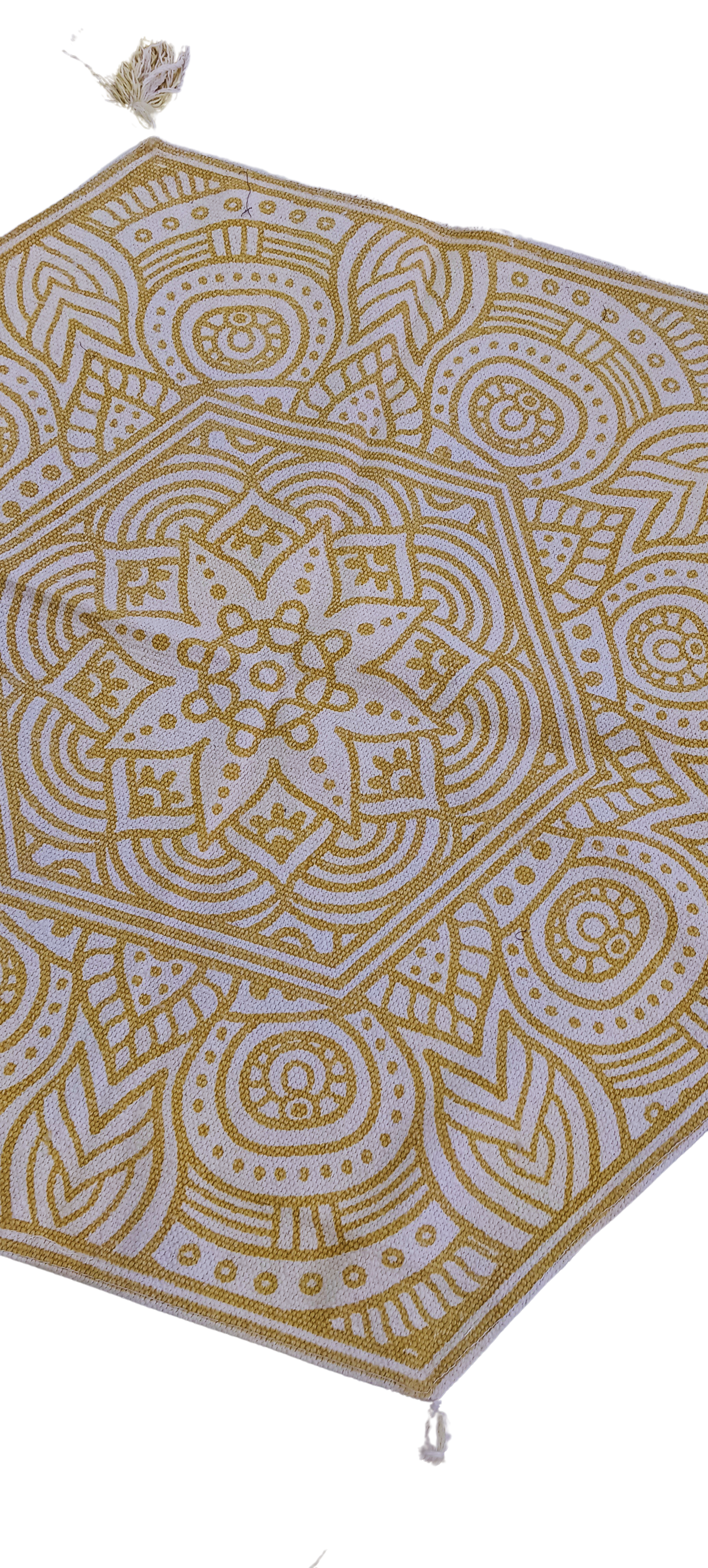 Elevate your interior with the artistic flair of this Hexagon Printed Cotton Dari/Rug. Designed with precision and inspired by traditional mandala patterns, this six-sided rug blends geometric charm with bohemian elegance. Made from eco-friendly cotton, it is both lightweight and durable, perfect for indoor use in living rooms, meditation zones, or as a unique coffee table accent.