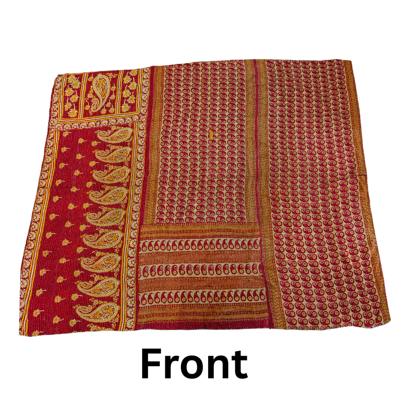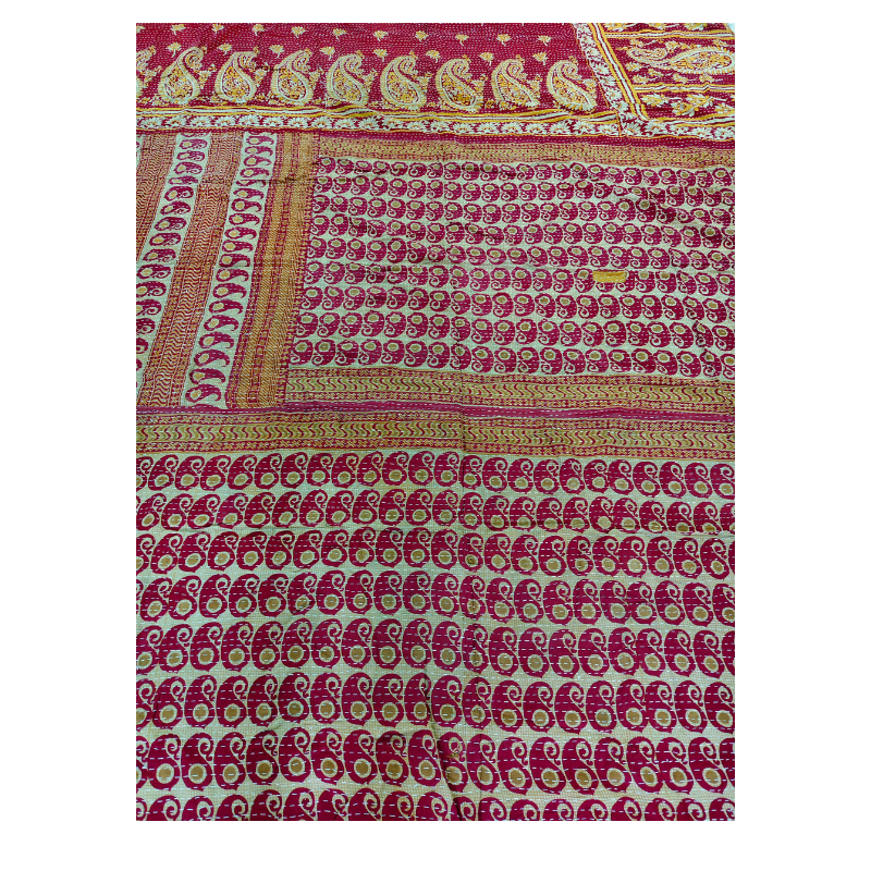 Add timeless elegance and rich cultural detail to your bedroom with this king size Kantha quilt, hand-stitched from vintage cotton saris. Featuring bold red and mustard tones with classic paisley and floral block prints, this quilt showcases the beauty of traditional Indian textile art.